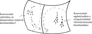 8.6. ábra. Az áramvonalak a B tartományban össze kell fussanak, mert a feketelyuk-szingularitásoknál információvesztés lép fel. Egyensúlyozza-e ezt az áramvonalaknak a kvantumos R eljárás következtében történő keletkezése (főként az A tartományban)?