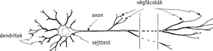 9.8. ábra. Egy neuron (gyakran viszonylag sokkal hosszabb a megrajzoltnál). A különböző típusú neuronok részletes megjelenése nagyon változatos