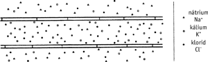 9.11. ábra. Egy idegrost vázlatos működése. A nyugalmi állapotban belül a kloridionok vannak túlsúlyban a nátrium- és káliumionokkal szemben, ez negatív töltést eredményez; kívül fordított a helyzet, ezért az eredő töltés ott pozitív. A nátrium/kálium egyensúly is más belül, mint kívül: belül több a kálium-, kívül a nátriumion