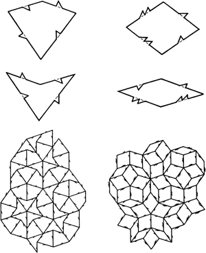 4.12. ábra. Két pár, mindkettővel csak nemperiodikus parkettázás készíthető („Penrose-parketták”); és a sík egy-egy tartományának lefedése az egyes párokkal