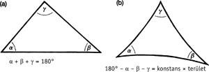 5.1. ábra. (a) Háromszög az euklideszi térben, (b) háromszög a Bolyai–Lobacsevszkij-térben