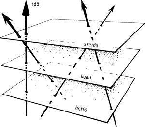 5.5. ábra. Galilei-féle téridő: az egyenletes mozgást végző részecskéket egyenes vonalak ábrázolják