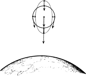 5.25. ábra. Az árapályjelenség. A kettős nyilak a relatív gyorsulást mutatják (WEYL)