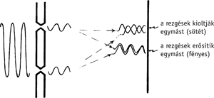 6.7. ábra. A tiszta hullámkép, a hullámok interferenciája megmagyarázza az ernyőn kialakuló, világos és sötét sávokból álló mintázatot (a diszkrét pontokat azonban nem)