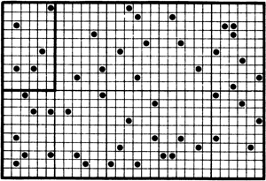 7.4. ábra. Egy dobozba zárt gáz modellje: kis golyók vannak elosztva sokkal nagyobb számú cella között. A cellák egytizede speciális. Ezek a bal felső sarokban megjelöltek