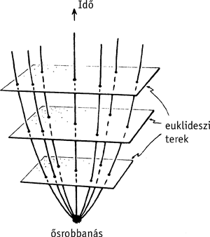 7.9. ábra. Egy táguló világegyetem téridőképe euklideszi térszeletekkel (két térbeli dimenzió látszik)