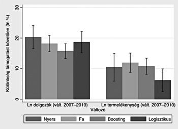 Végül, a 3. ábra tartalmazza a hatás becslését, vagyis azt, hogy átlagosan mennyivel növekedtek gyorsabban a támogatott vállalatok 2007–2010 között, mint a kontrollcsoport cégei. Az látható, hogy a különböző kontrollcsoportok alapján kapott eredmények nem térnek el egymástól 5 százalékos szignifikanciaszinten. A kép nagy vonalakban azonban az, hogy a támogatás segítette a vállalatok növekedését, és bizonyos mértékben a termelékenységük fellendítését is. Ez az eredmény mindegyik kontrollcsoport mellett megmarad, nem függ attól, hogyan jelezzük előre a kezelés valószínűségét.